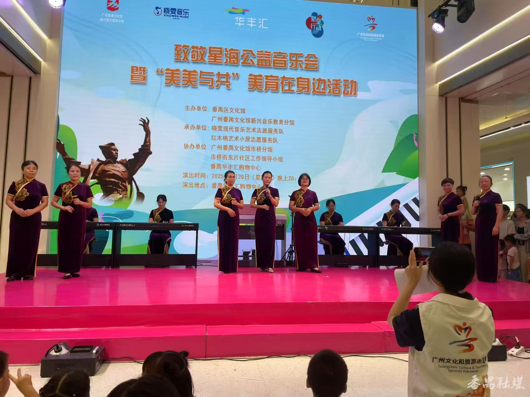 本次活动由番禺区文化馆、番禺文化馆新兴音乐教育分馆主办,晓雯现代音乐艺术志愿服务队、红木棉艺术小屋志愿服务队承办。番禺区文化馆一直致力于让文化馆成为人民群众的终身美育学校,打造“美美与共”美育品牌在身边品牌活动,通过整合社会资源,让艺术走出场馆、贴近大众,真正实现全民艺术普及的目的。