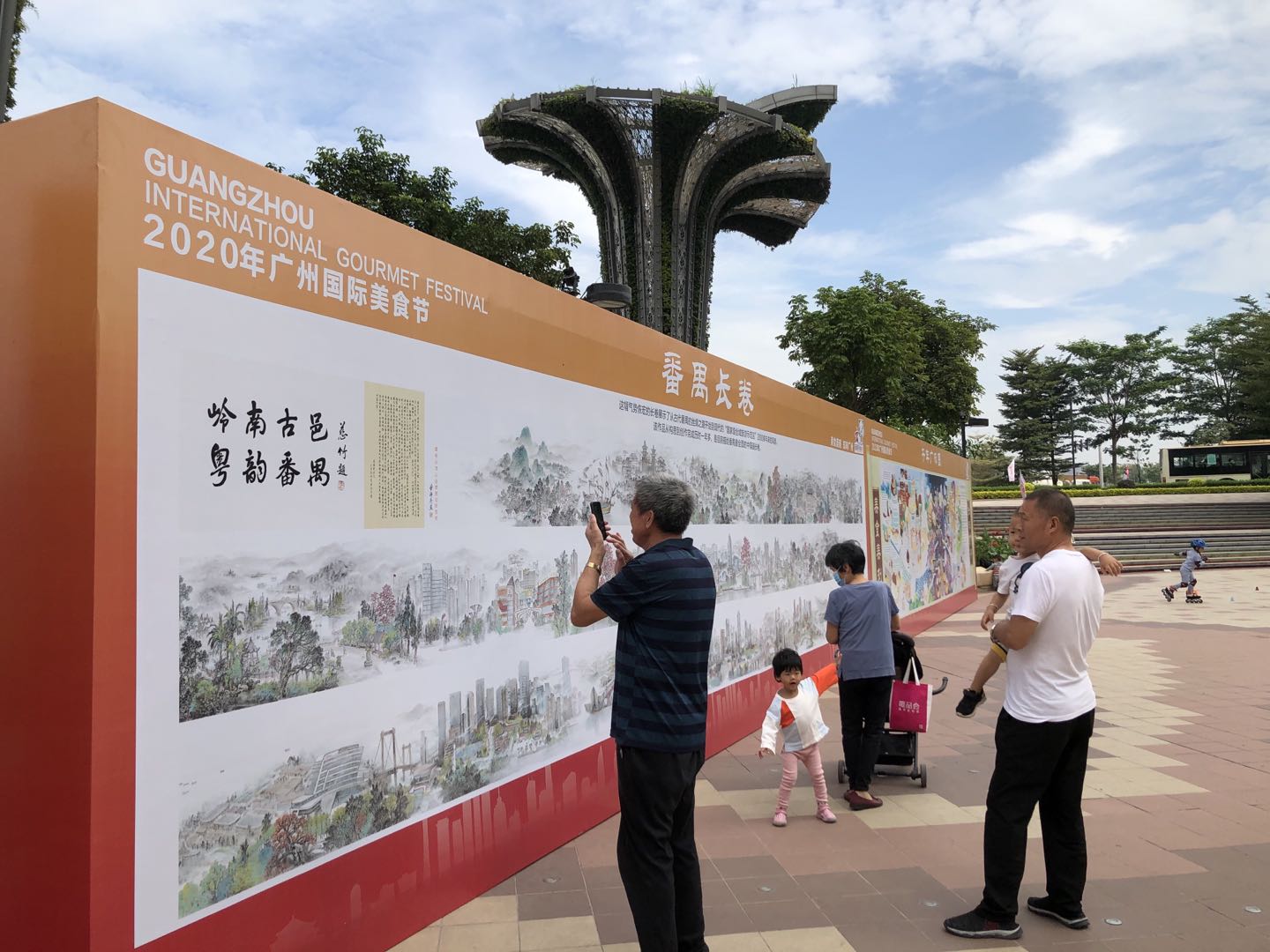 在主会场的广场上,一道充满水墨书香气息的宣传文化廊十分抢眼。长廊左半部分是“番禺长卷”,该作品展示了从古代丝绸之路开始到现在的“国家全域旅游示范区”,2000多年来番禺的人文风貌,惟妙惟肖的画卷如一部番禺的浓缩史,记录了番禺灿烂的文化历史,展示时代精神。该作品创作历时1年多,是目前描绘番禺区最全面的长卷。