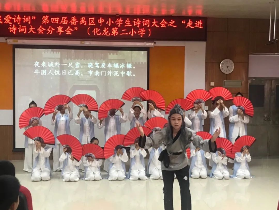 随后,就是深受同学们欢迎的“诗词大赛”环节。记者在化龙二小现场看到,同学们踊跃举手回答问题,无论是做选择题,还是看图猜题,均胸有成竹。最后化龙二小星空经典阅读社带来的表演《和白居易一起穿越四季》将活动带入高潮。节目中,同学们选取白居易的四首诗歌《钱塘湖春行》《池上》《琵琶行》《卖炭翁》为主体进行了创编,配以音乐、情景,赢得全场掌声。据悉,该节目曾获得番禺区阅读系列活动之“唐韵童声”一等奖。
