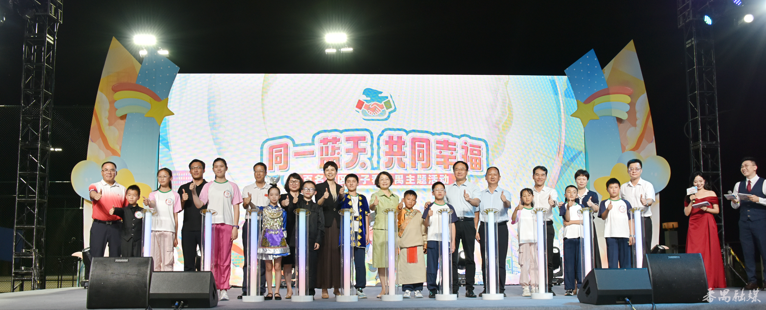 活动现场,领导嘉宾分别为支持本次活动的爱心企业及恒润实验学校颁牌,向20名老区孩子代表颁发了社会实践证书,并与10个地区的孩子代表共同点亮象征老区与湾区情谊的“幸福之光”,寓意两地人民心连心、手牵手,共同迈向更加美好的未来。