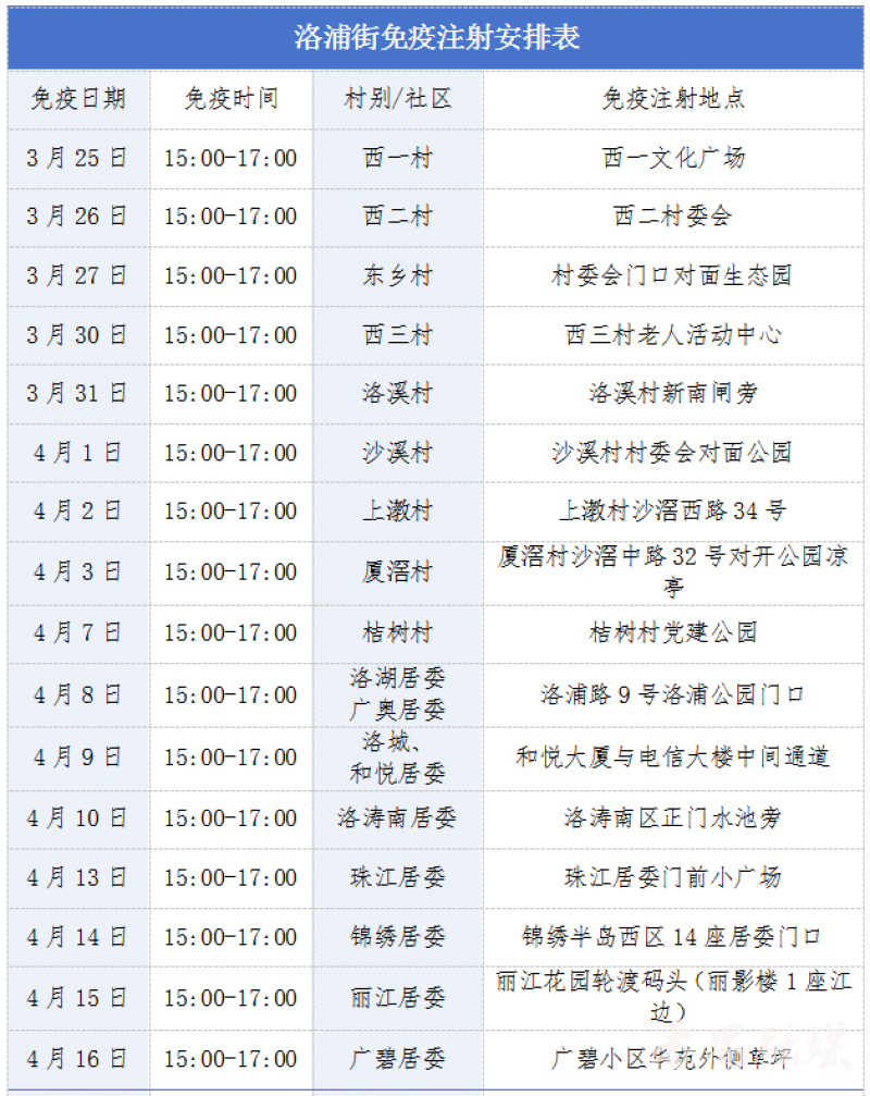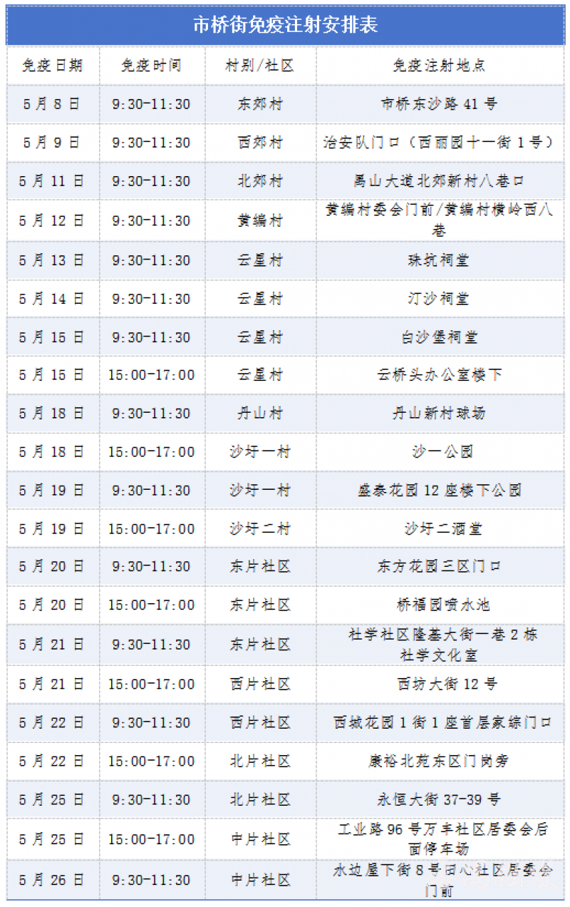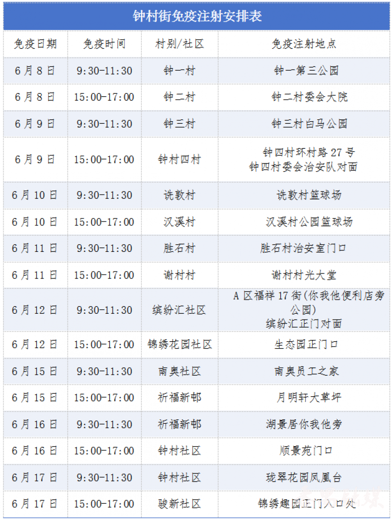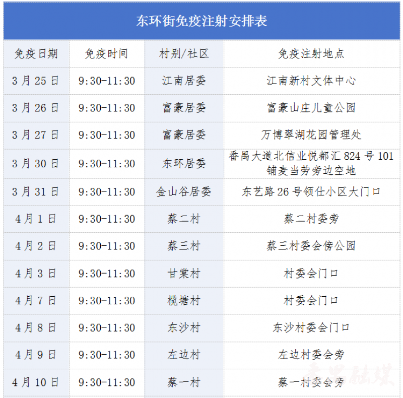 此外,若错过村(居)集中接种时间,居民可前往常年免费接种点补充接种,其中市桥街捷进中路64号(联系电话:84870448)、钟村街钟韦路38号(联系电话:84771247)均设有常年接种点,接种前建议提前电话预约。