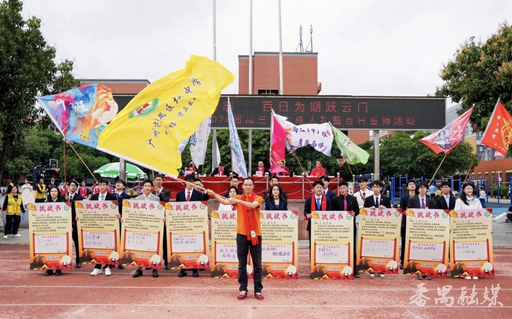 在全场倒计时中,校领导、家委与学生代表共同揭幕高考倒计时牌,百日冲刺正式启航。各班班长宣读挑战书,班级间良性比拼尽显昂扬斗志;高三级长简万锋挥舞校旗,全场高呼“高考必胜”,百日征程,势在必得!