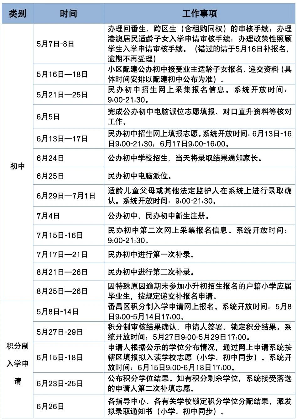 公办初中招生面向回番生、租购同权学生、跨区入学学生、广州市政策性照顾学生及港澳居民适龄子女,此类群体需在5月7日—5月8日向属地教育指导中心申请入读初中一年级,错过可于5月16日补报名,逾期不再受理。