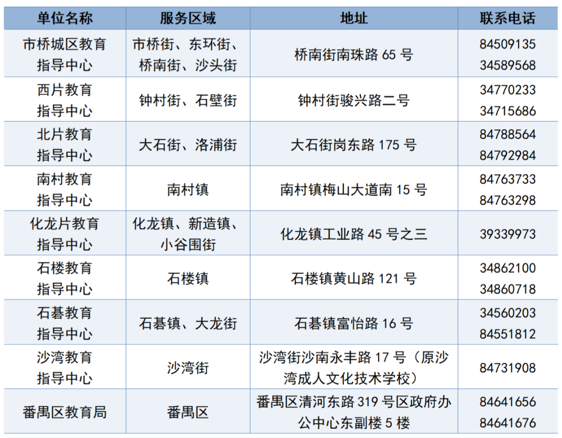 番禺区教育局及各教育指导中心联系方式