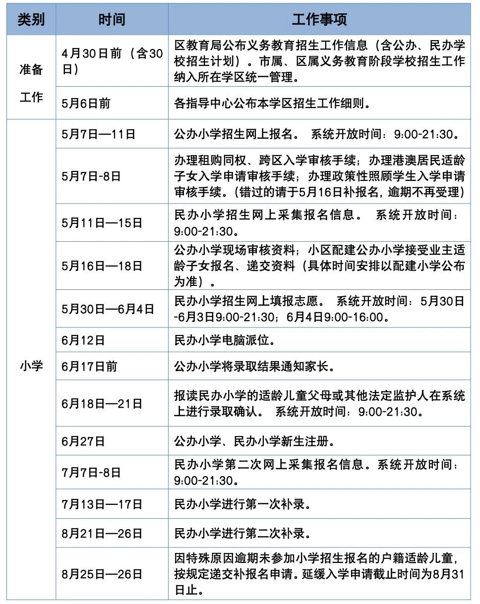6月5日前,需完成公办初中电脑派位志愿填报、对口直升资料核对等相关工作;6月24日,公办初中完成学生录取,并于当日将录取结果通知家长;7月4日为公办初中统一注册时间。