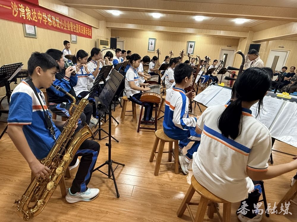 活动现场,学校民乐团率先登场,合奏广东音乐经典曲目《赛龙夺锦》,旋律悠扬激昂,充分展现沙湾本土非遗魅力。