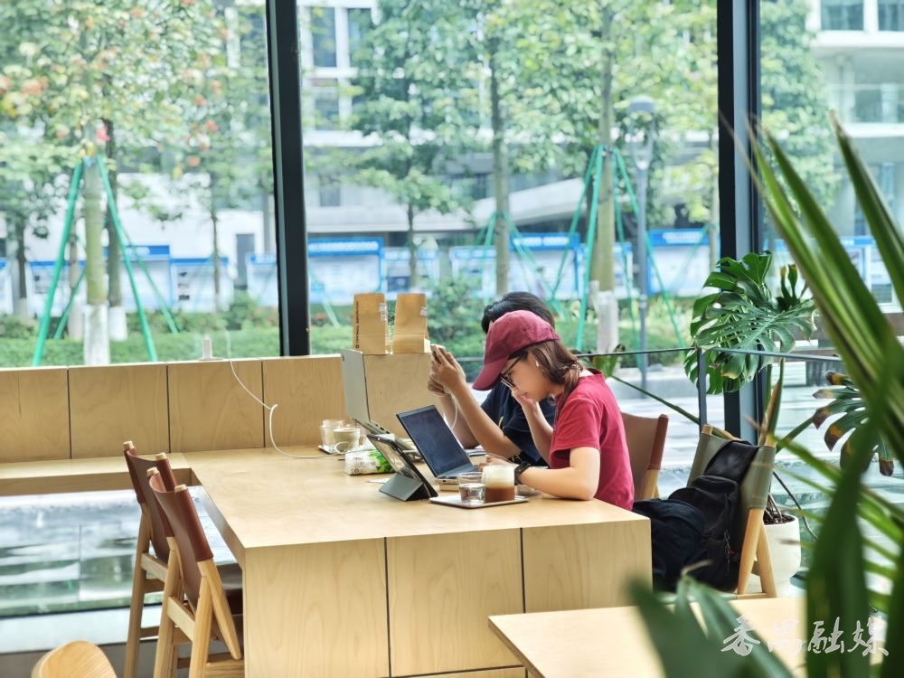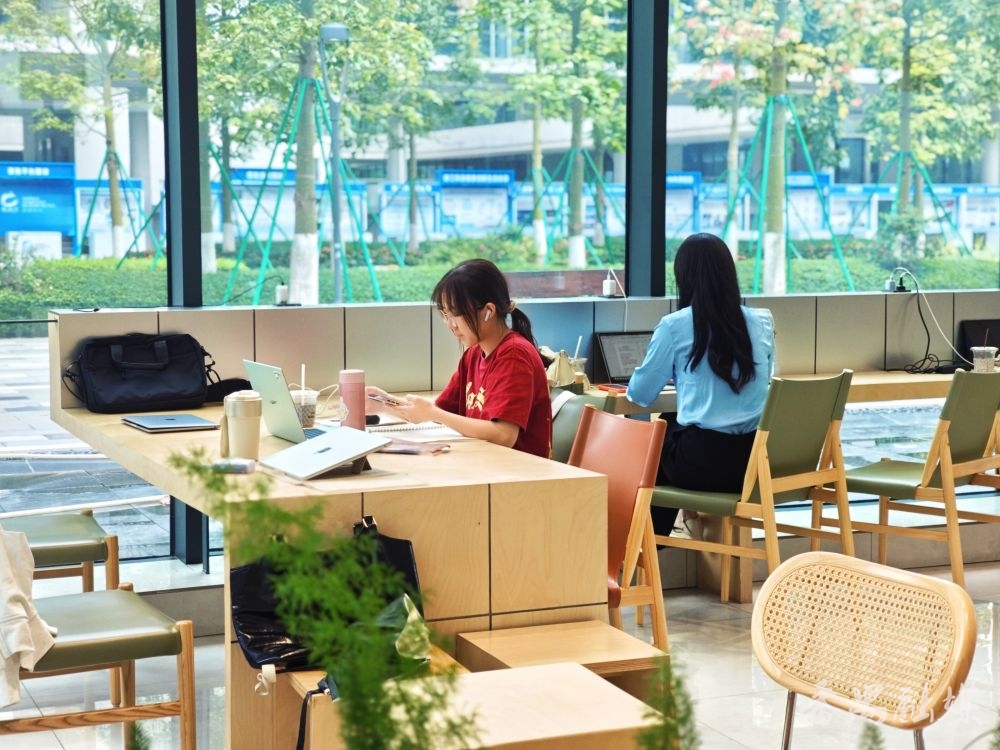 店内的每一处,都藏着满满的松弛惬意。长桌旁,有人对着电脑敲下灵感,指尖划过屏幕的声响,和咖啡杯碰撞的轻响,在阳光里慢慢发酵;藤编椅上,有人低头翻着书页,阳光在纸页上跳着舞,连时间都慢了下来。室内盛满人间清欢,室外则是留给风与自由的角落,桌椅舒展、绿植葳蕤。“这里不只是能安心学习的地方,更是我们小组讨论、碰撞创意、迸发灵感的‘秘密基地’。”常来店里交流项目的大学生创业者小杰分享道。