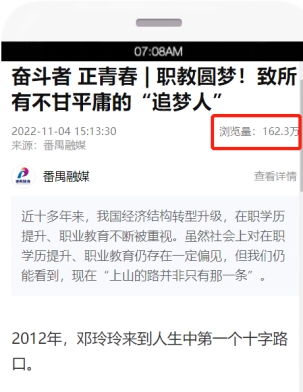 《奋斗者 正青春 | 职教圆梦!致所有不甘平庸的“追梦人”》在新华社客户端阅读量达162万《2022年11月4日,新华社客户端》