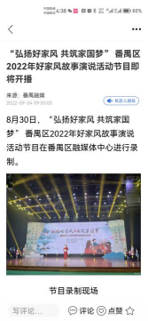 掌上番禺客户端发布报道 《“弘扬好家风 共筑家国梦” 番禺区2022年好家风故事演说活动节目即将开播》(2022年9月4日)