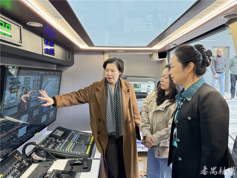 在番禺区融媒体中心相关负责人陪同下,参观组来到新引进的“4K + 5G”AI新媒体直播车,了解该车的技术设备、应用场景,以及在报道重大事件、追踪民生热点等方面所发挥的重要作用。
