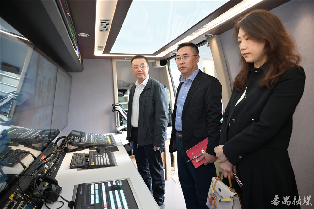 随后,参观组来到600平方米演播厅,观看番禺区融媒体中心宣传片,全面了解其在新闻采编、节目制作、新媒体运营等方面取得的成果,并了解该厅的设备配置、功能和使用情况。调研组还参观了调度指挥中心,全面了解融媒体矩阵平台具备的功能、建设情况,及其在新闻产品“策、采、编、审、发、评”过程中发挥的作用。